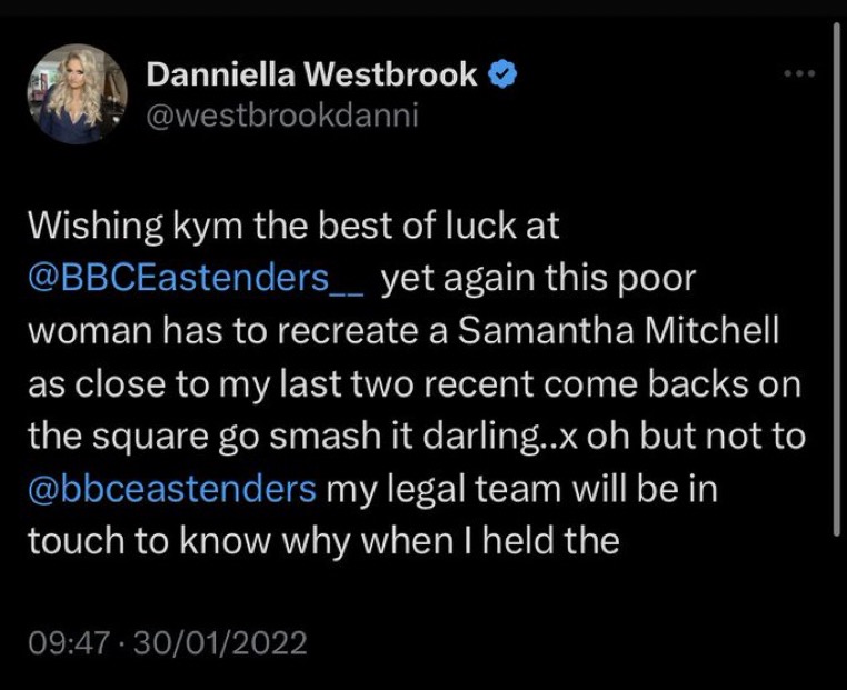 From June to July 2016, Danniella returned for a set of episodes for Peggy Mitchell's funeral before departing again. In January 2022, Westbrook was rumoured to be returning as Sam but the role was given to Kim Medcalf, who took over from Westbrook in 2002. Upon hearing that Kim was taking over the role again, Westbrook took to Twitter saying she wished "that bird Kym" the best of luck in portraying a Sam Mitchell as close to her previous portrayal, and saying that her legal team will be in touch with EastEnders. In November 2022, she would tweet "there's an unnamed soap on at my friends house. It's so bad it's like watching paint dry." Implying she did not get anywhere with a legal case and now holds a grudge against EastEnders.