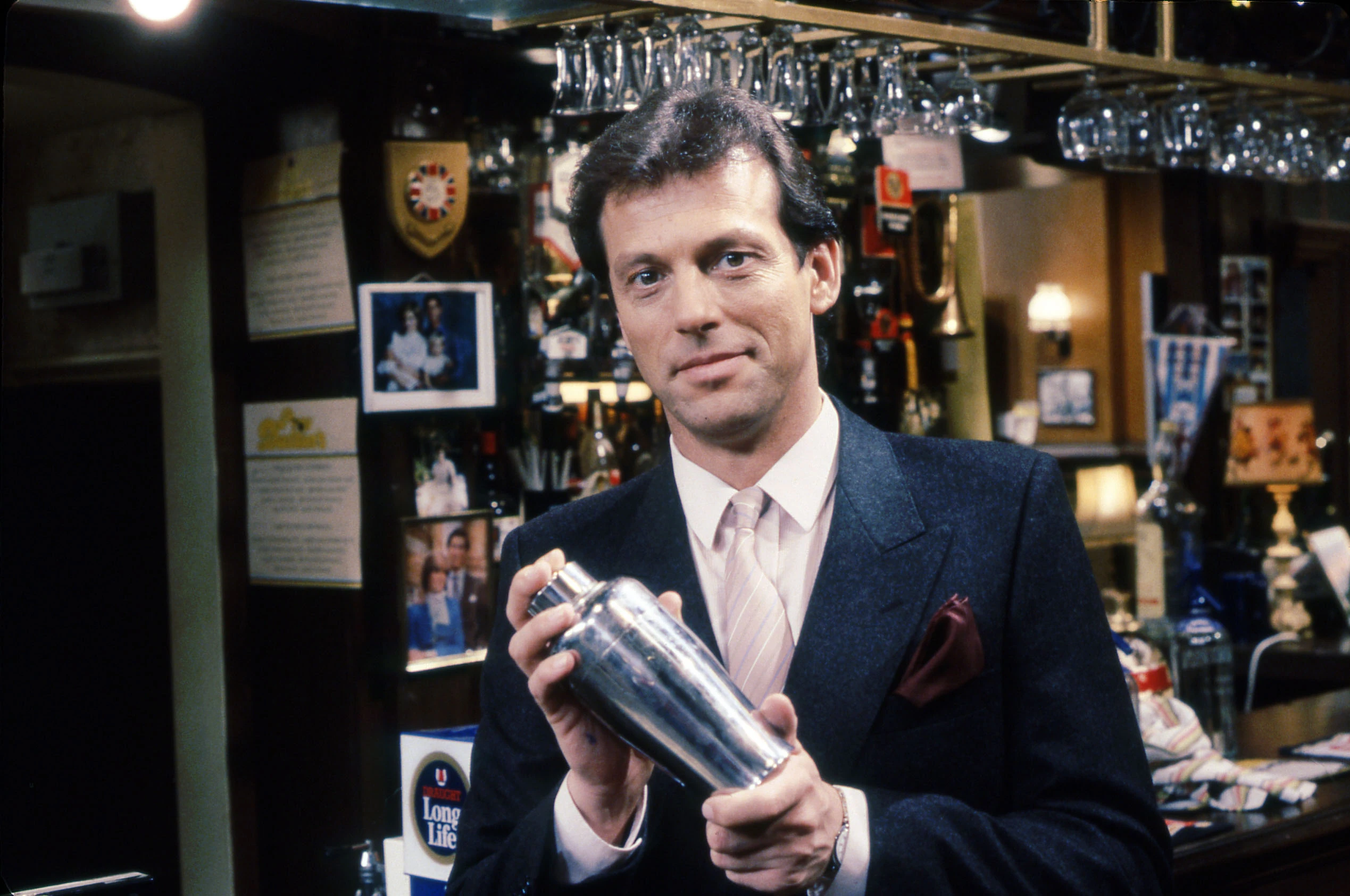 - In late-1984, Leslie Grantham won the role of Den Watts, the womanising small-time dodgy landlord of The Queen Vic. In February 1985, Grantham's 1966 conviction for murder was front page news. He not dismissed due to having served his sentence, and was welcomed by cast members despite him initially offering to quit the role if his past made them uncomfortable. Due to his major role in the show, and that characters rollercoaster relationship with Angie, Leslie Grantham and Anita Dobson (who played Angie) were under media scrutiny all the time.
