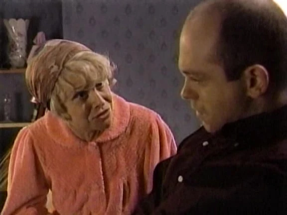 Michelle and Geoff go to see Nellie. She gives them a tea service for a wedding present. Michelle goes home and shows it to Ruth and Mark. Ruth giggles and they tell Michelle they've decided to get married. She is thrilled for them. Ruth is going to Scotland to square it with her parents (though she thinks it'll be tricky), so Michelle isn't supposed to tell anyone yet. Della has a customer who goes on about holiday in Amsterdam. Della is listening as she describes the great time and sighs. She gets restless about going away and annoyed at how long she'll have to save up to get a trip even to Holland - she mentions it to Binnie. She's moping in the Vic and Peggy lets her go home. Della is still miserable but Binnie sets up a dinner with candlelight. Della is pleased and happy and Binnie says maybe they can save up and go away. They are affectionate to each other. David takes Bianca out shopping. Tiffany goes too and tells him that she knows all about him while Bianca is changing. She also makes Bianca choose the most expensive dresses. Tiffany goes and gets a black "dress". David says there's more material in the label and that she can't wear that. Bianca tries it on to spite him. He goes home fairly happy about the situation. Bianca thanks him. Pat isn't too impressed. Peggy asks Grant where he was so late last night and if he saw Sharon. He doesn't reply and she guesses that he did. She keeps talking about Sharon and eventually Grant tells him it was Sharon who had an affair. Peggy is astonished. says that it wasn't him who did it. Peggy is astonished and says it's possible to forgive her. She asks where Phil was when it all happened. Grant tells her that he was the one in bed with Sharon! |