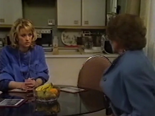 Sharon sees Jan crying in her car and when she goes to see if she is okay she drives off. Den gets drunk and tells Pete that Jan turned out to be a tart like everyone else he has been with. Sue keeps Ali company during his night shift at Ozcabs but does not tell him about the lump on her breast. Den goes to Kathy and Pete's flat and spends the night there. Arthur makes breakfast for Martin. Lou is delighted to see Arthur improving and apologises to him for contributing to his depression. Lofty and Michelle agree to not let Sharon and Simon use their flat for sex, so Sharon tells Simon she will ask Kathy if they can use her flat. Colin gives Pauline the AIDS leaflet for Dot to read. Pauline gives it to Dot and she throws it in the bin, but Ethel takes it out again and keeps it on her. The pair meet Arthur in the Vic and he gives them their money back. Ethel hands Dot the AIDS leaflet once again and tells her she is not being a good Christian by singling Barry and Colin out. James tells Den that The Dagmar and his customer audience is different to his so they should not be in competition. Dot and Ethel's argument causes Ethel to walk out and cry. Debbie goes off James and makes a comment to him when he sees her. She then sees Ethel visibly distressed and takes her for a chat to help calm her down. Simon learns that Sharon is planning to go on the pill and tells her that contraception should be down to him as he does not want her messing up her body. The Osmans enjoy a family party in the café. The phone rings and Ali answers it- it is the breast clinic phoning for Sue. She takes the phone off of Ali and confirms her appointment. He is left in shock. Kathy does not let Sharon and Simon have the flat to themselves. June Watkins visits Kathy and asks her if they can talk. Den asks Angie to help him get back on top of the books in the Vic, she laughs at him and refuses to help him. Ali promises to support Sue now he knows about the lump. June tells Kathy that the child she gave up for adoption has grown up and wants to meet her, but it is up to her as to whether they meet or not. |