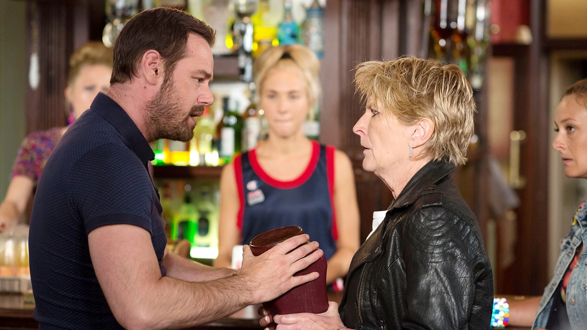 Tina invites Shirley for coffee with Mick but she declines. Tina wants to scatter Stan's ashes by the old Billingsgate market and hopes Shirley will come if Mick asks her – she knows he still cares. Mick calls at Shirley's flat, but they're interrupted when Dean and Roxy return from walking Lady Di. Mick fumes to see Dean with Lady Di. Shirley objects that Tina said Lady Di living with them was his idea and defends Dean. Mick storms back to the Vic with Lady Di and berates Tina for her deception. Shirley's right behind him and grabs the urn of Stan's ashes. Mick snatches it back. The urn falls and spills yellow powder everywhere. Perplexed, Mick tastes it - it's custard powder. The family hotfoots it to Blades where Mick accuses Dean of taking the ashes. Dean laughs, asking who uses custard powder. The penny drops - Aunt Babe. Mick and Tina head for Babe's house where a stranger informs them that she's moved to Ramsgate. They return to Shirley and ask her to go with them. She initially refuses but when Mick reminisces about past trips to Ramsgate as kids and appeals they can't say goodbye without her, she agrees. Lee offers to take Whitney to work but she claims she wants to walk. When he confides in Nancy his fears that Whitney's seeing someone else, Nancy thinks they should talk and asks him to cover her afternoon shift. Later, Lee ignores a call from Sergeant Major Wallace and surprises Whitney in the café; she tries to backtrack that she got the wrong day at work but Lee knows she's got another bloke and demands she stop lying. Whitney admits she lost her job and didn't want to worry him – she's concerned about his moods and that he's not at work again. Lee claims it's his day off. Later, Sergeant Major Wallace arrives at the Vic. Bickering Denise and Vincent aren't happy when Kim lumps them with Pearl. Vincent has a present for Patrick. Denise thinks that he's buying him off. Vincent reveals he got Winston to track down Patrick's hit single with The Five Hectors. Denise is unimpressed, to Vincent's bemusement. |